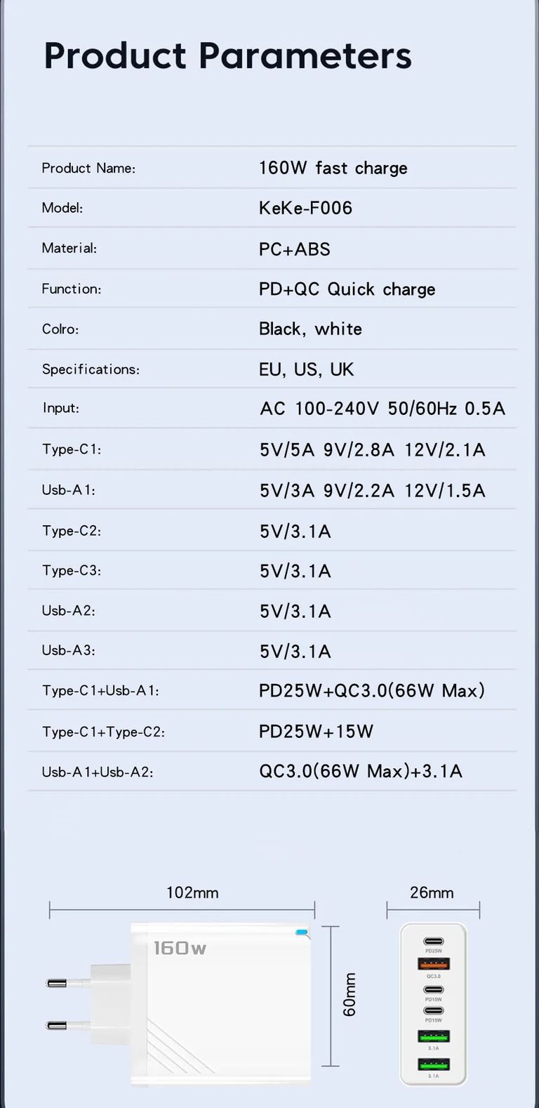 160W USB Type C Charger Multi Ports Fast Charging Phone Adapter ,UK Plug Wall Charger
